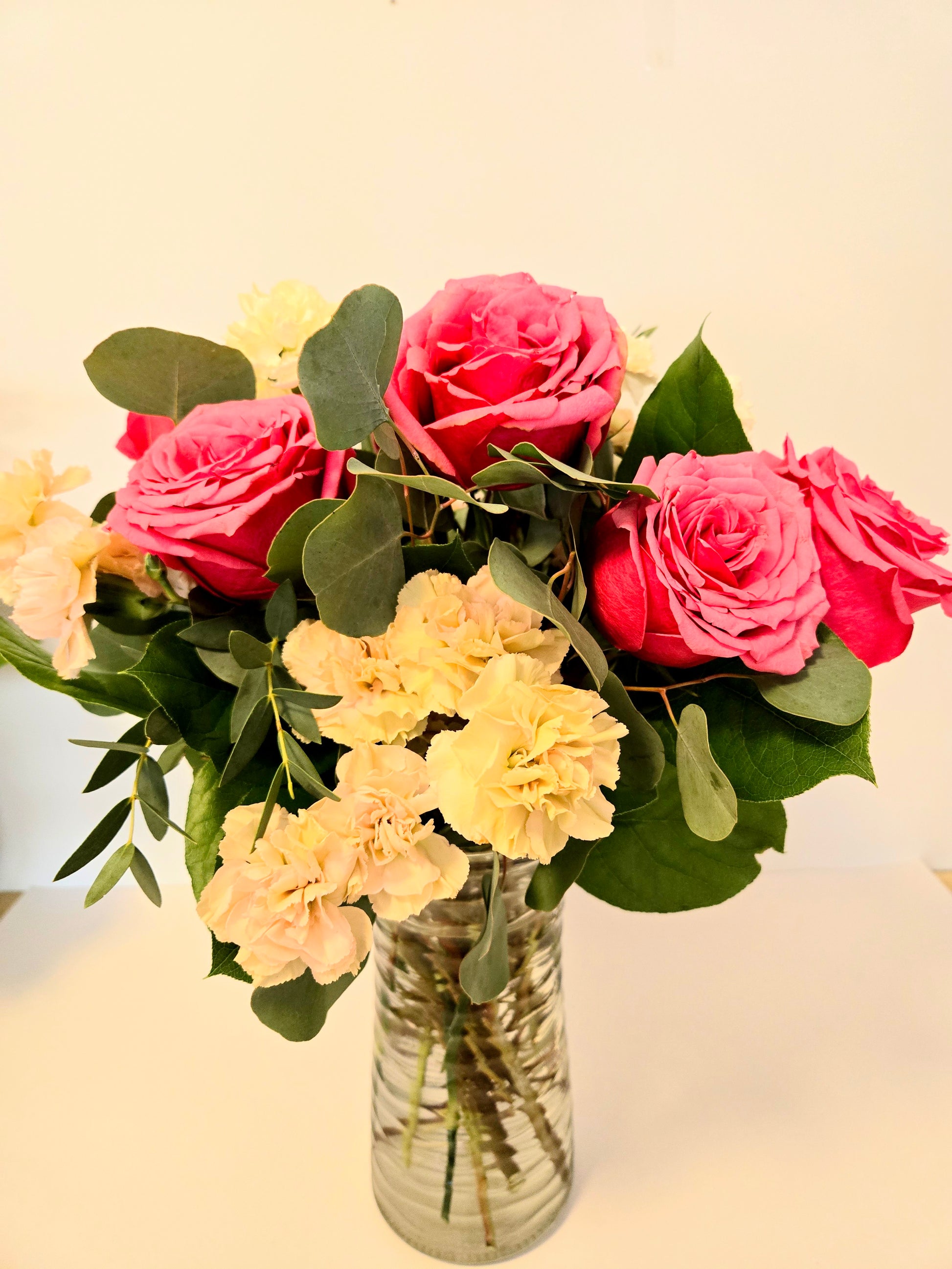 Six Pink Roses with butter yellow and blush carnations nestled amongst green foliage and fragrant Eucalyptus.