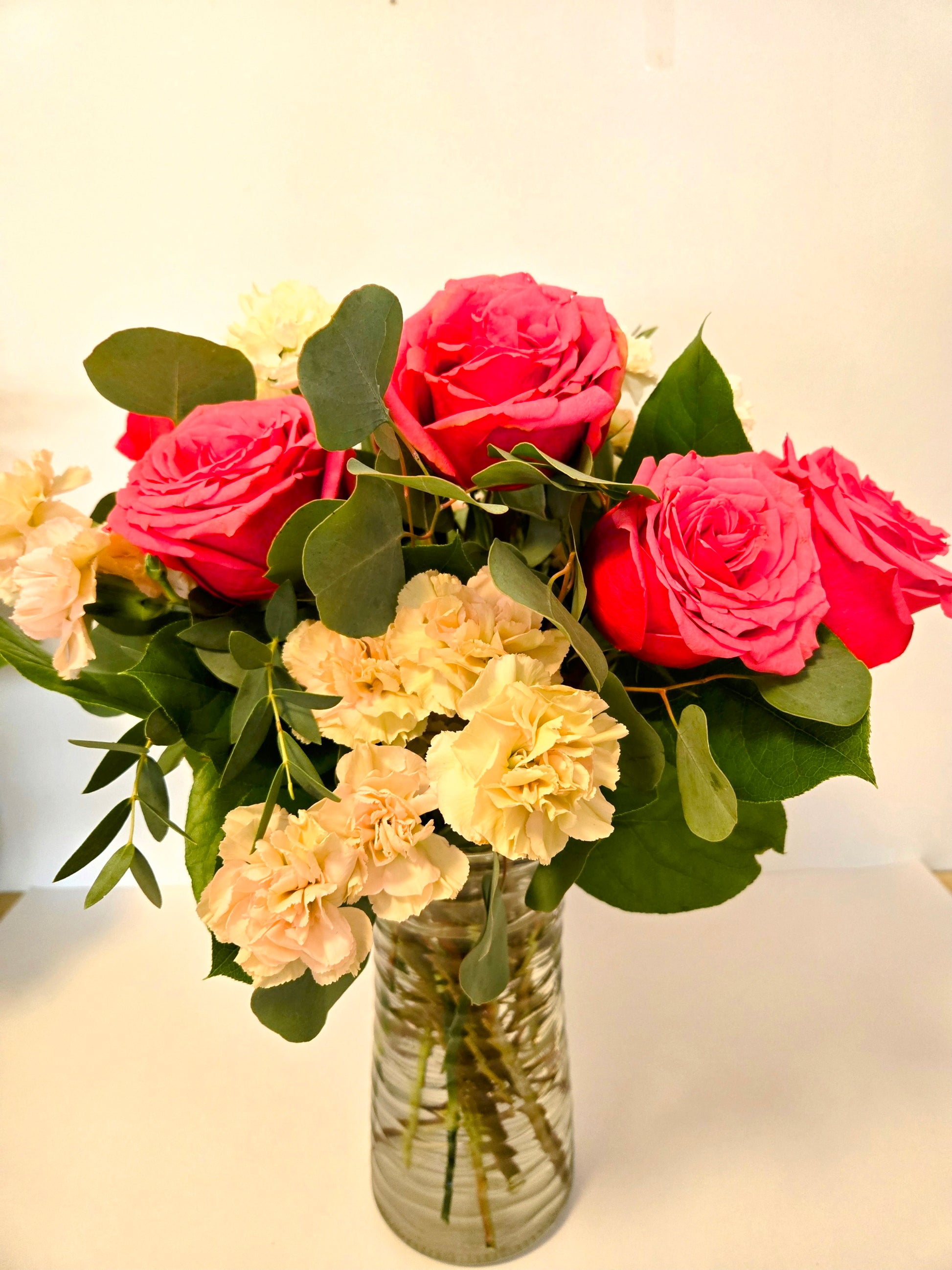 Six Pink Roses with butter yellow and blush carnations nestled amongst green foliage and fragrant Eucalyptus. This is an all around design, with blooms showing at all angles. Designed in a medium sized Vase.