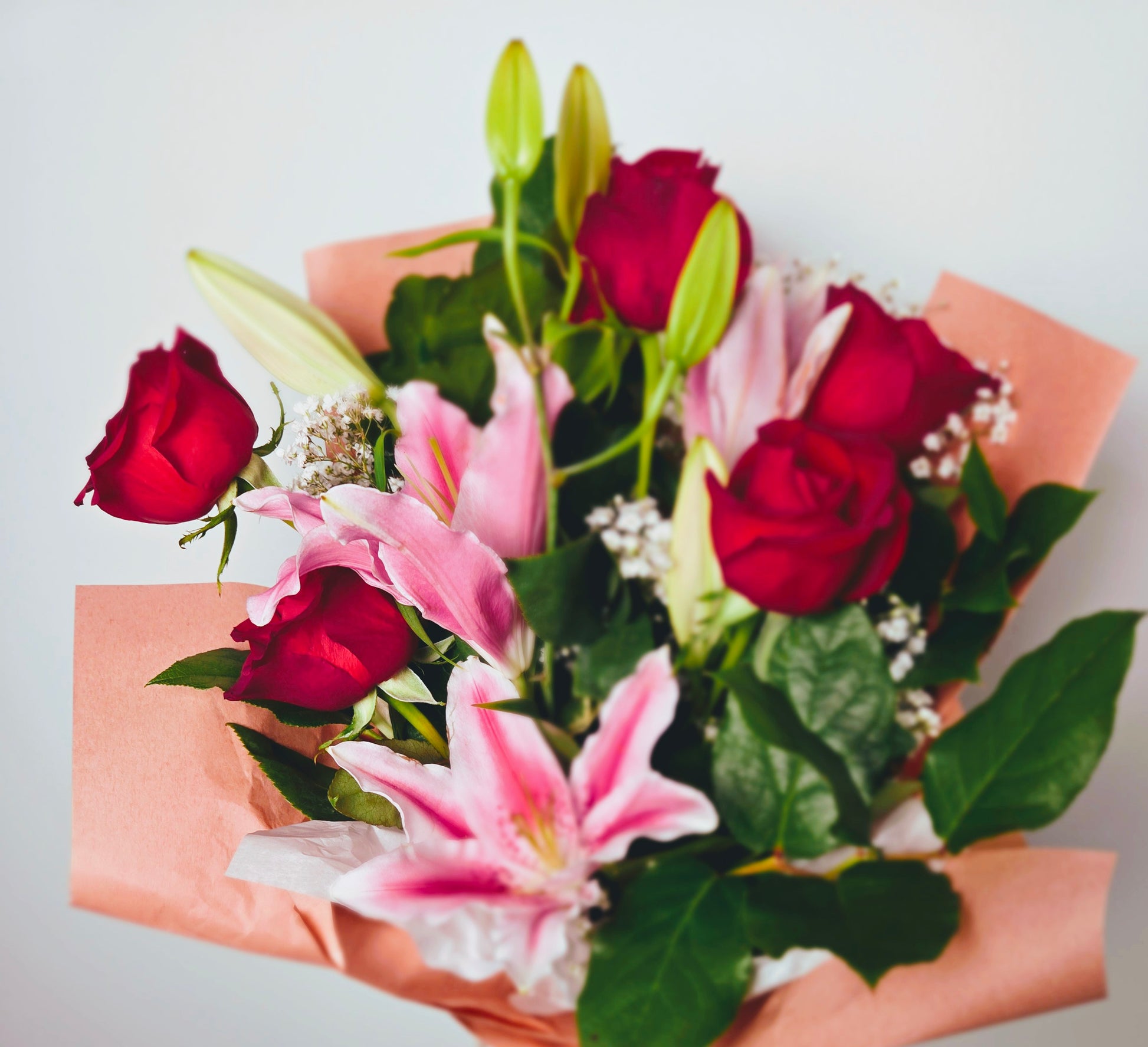 Six Red Roses and Lilly's with greens and babys breath, hand tied bouquet. Does not include a vase